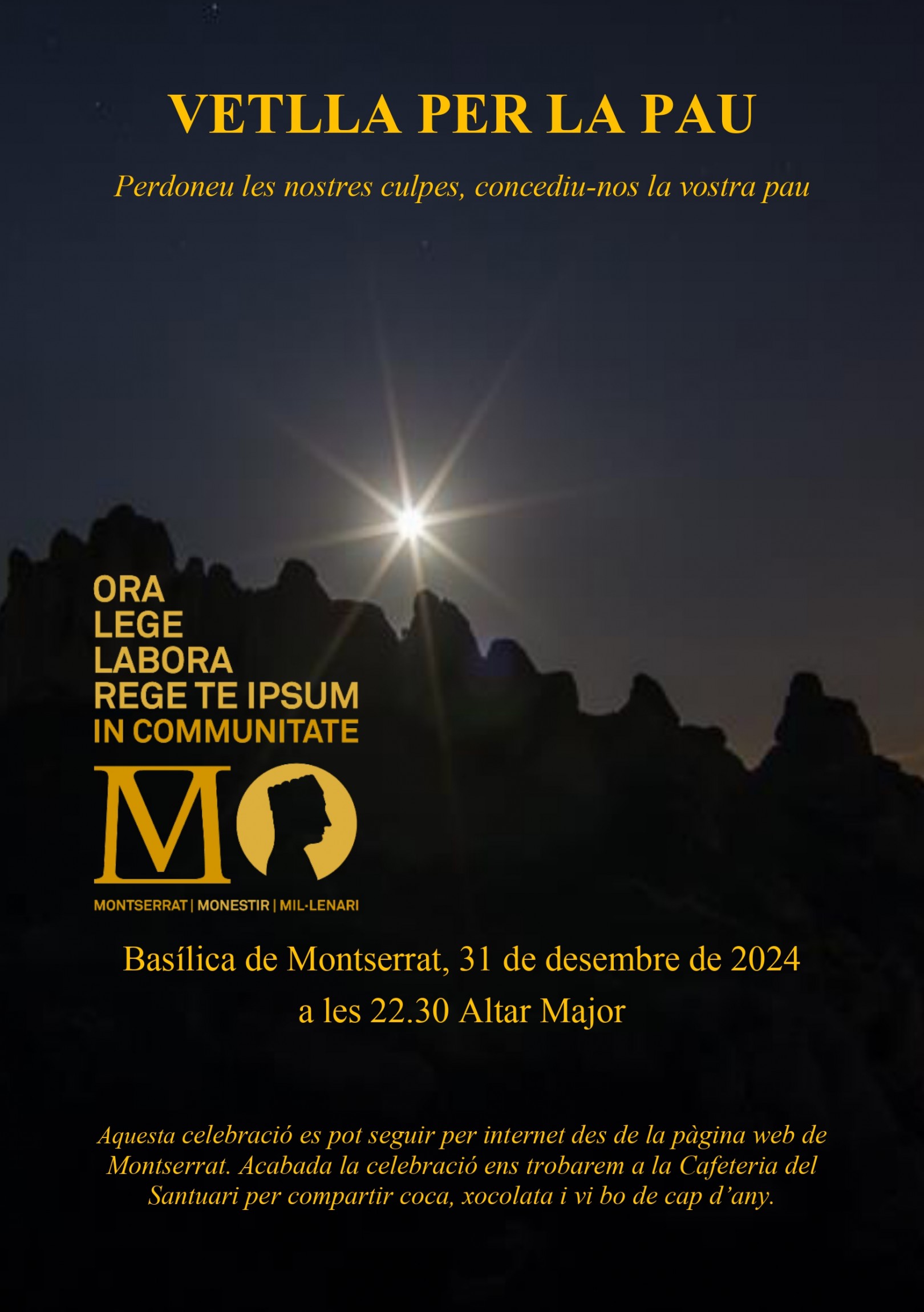 Aquest dimarts 31 de desembre, últim dia de l’any, a les 22.30 hores, celebrarem una Vetlla per la pau a la Basílica de Santa Maria de Montserrat on us convidem a participar-hi.