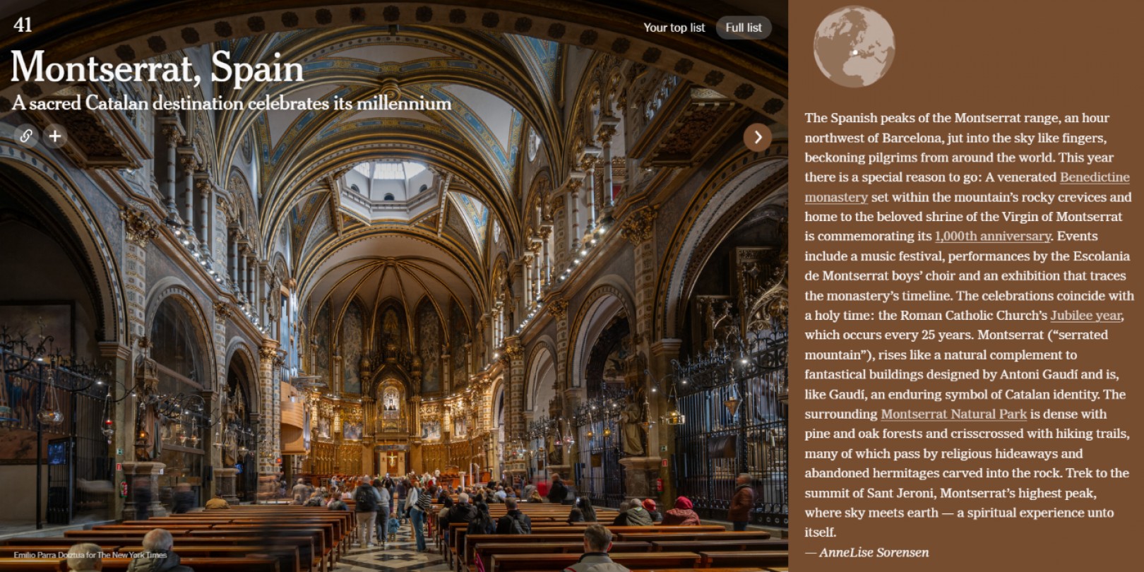 Aquest any 2025 la llista incorpora Montserrat i el seu monestir benedictí entre les 52 destinacions que ha decidit proposar als seus lectors. L'elecció respon, en gran part, a la celebració de Mil·lenari de Montserrat i comença destacant-ne