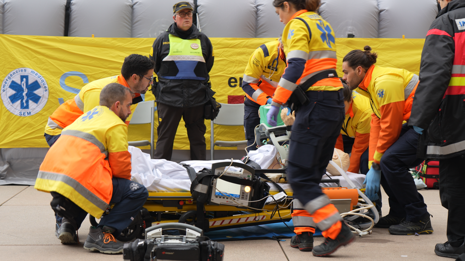 L'exercici de simulació, en què s’ha escenificat un cas real d’assistència d’aturada cardiorespiratòria, s’ha fet seguint tots els passos des del moment de l’entrada de l’alerta a la Central de Coordinació Sanitària del SEM a través del 112 / 061 fins al trasllat del pacient a l’Hospital amb ambulància medicalitzada.